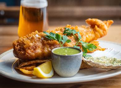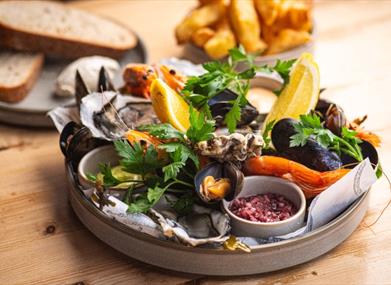 Flying the flag for a fresh sustainable catch from UK waters, the menu changes daily depending on the coastal landings, with fish and shellfish displayed for customers to see in a unique roll-top bath full of ice. The likes of prawns, scallops, mussels and oysters are almost always on the menu, with crab, lobster, sea bass, sole, plaice, skate, hake and monkfish also making regular appearances.
