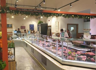 The butchery counter boasts the finest cuts hand-selected by a team of excellent butchers. Grass-fed beef, lamb, pork, free range poultry and game – the butchers are always ready to share their knowledge so customers can prepare the best meal possible. Filled bagels are available to takeaway alongside hot drinks for anyone driving past on the A36. Also, the most delicious array of hearty pies, huge Scotch eggs, savoury slices, cured meats and salads.