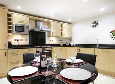 A small, gated sun-trap patio leads to your own front door and then into the relaxing living area. The lounge is furnished with a plush leather sofa and armchairs, and oak furniture, making it a lovely space for relaxing after a day enjoying Bath – no car is needed for exploring the city, everything is within easy walking distance.