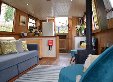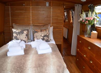Topsy is our 55-foot wide-beam boat. She is very spacious and has six berths with two double cabins and a very comfortable sofa bed. On entering the boat from the stern, you'll find the galley, complete with full-size cooker, fridge with freezer, kitchenware and a dolce gusto coffee machine. The beautiful galley has oak work tops and cottage style cupboards.