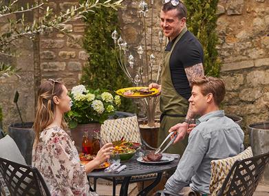 The living room is a cosy space that still feels luxurious with big sofas to sink into in front of a wood burning stove. The warm colours chosen for the soft furnishings complement the tones of the local stone used around the fireplace. There’s a separate dining room adjoining the kitchen which you’ll find fully-equipped and a private chef is available upon request for special occasions. Or, you could take the cooking outside to the pretty private terrace which is equipped with a Kamado Joe grill and enjoys direct sunlight in the afternoons.