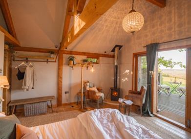 Inside, the treehouse is warm, inviting and finished with natural materials. The bedroom offers calming woodland views, while the standout wet room with a glass ceiling lets you shower beneath the treetops—an unforgettable, immersive experience that brings the outdoors right inside.